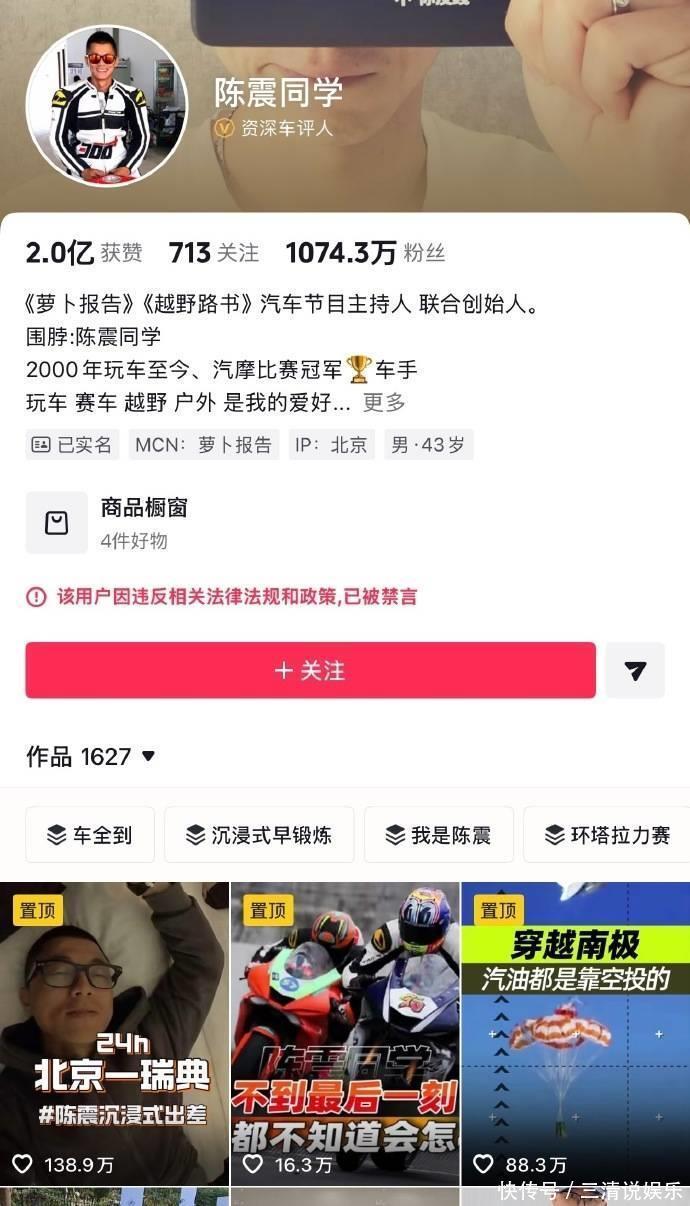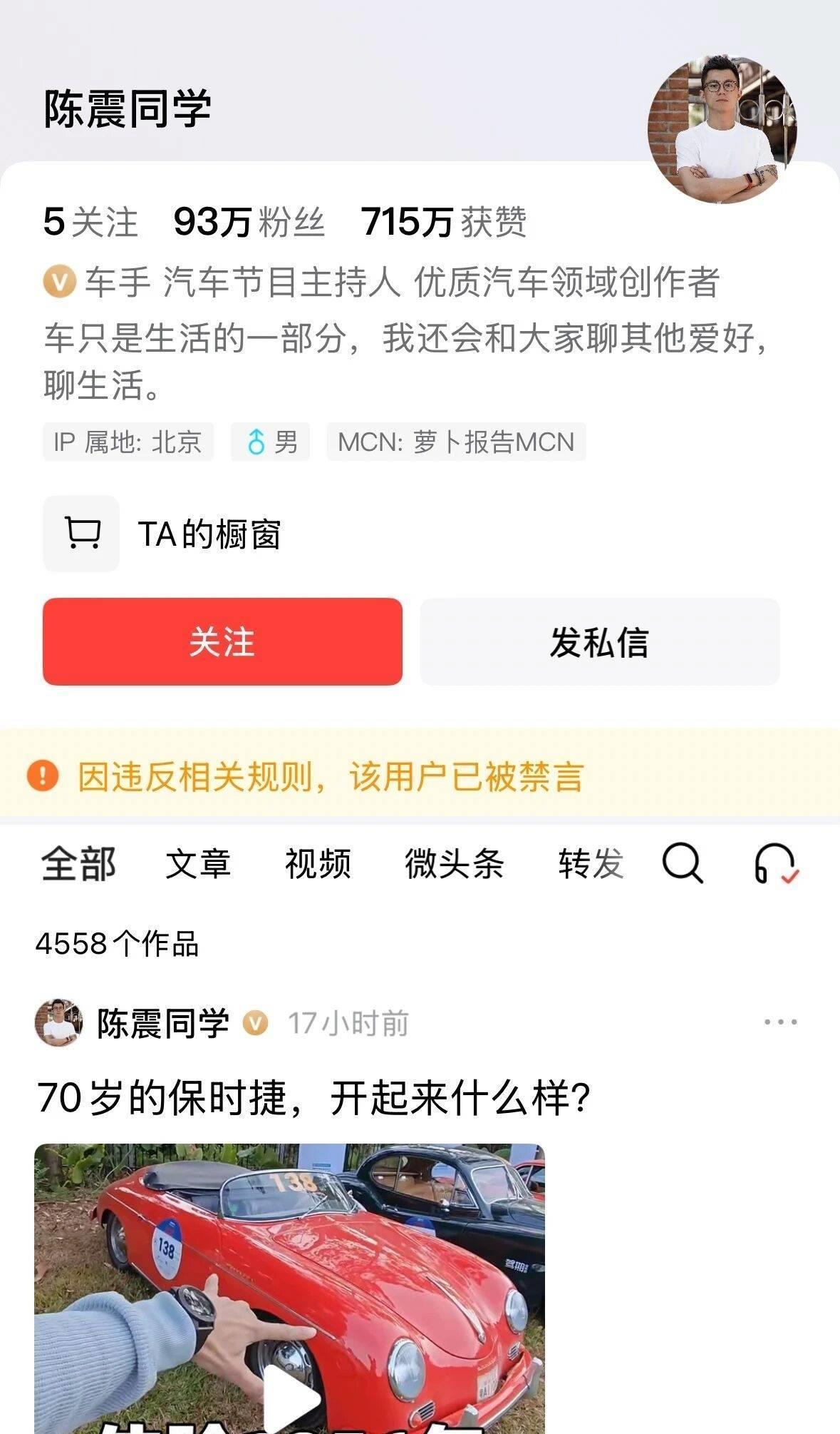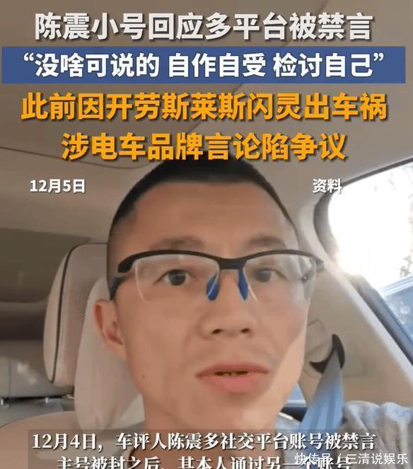 2400 万粉车评人陈震全网禁言,争议背后是流量与底线的博弈12 月 4 日深夜,车圈大 V 陈震的社交账号彻底 “失声”—— 微博、抖音、B 站、小红书等全平台同步禁言,B 站直接显示 “封禁中”,平台提示均为 “违反相关法律法规” 或 “社区规则”。